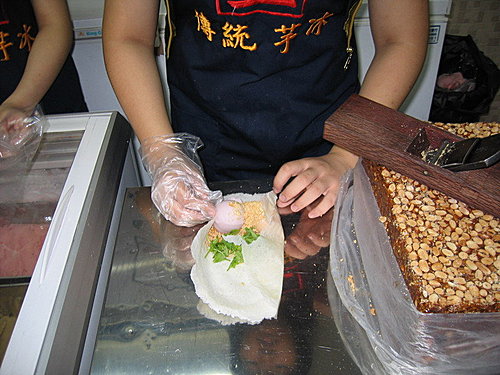 來到宜蘭當然要點花生糖冰淇淋囉,你看妹妹熟練的技巧