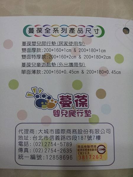 有台灣總代理"大城市國際商務股份有限公司"進口者,始為正規台灣公司貨的蔓葆地墊喔~~~