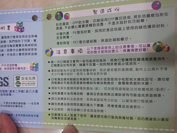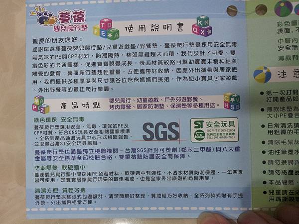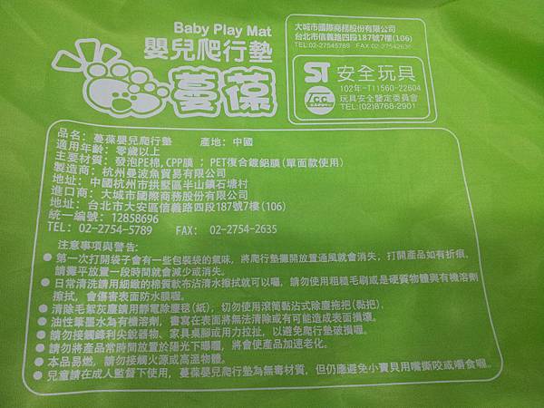 但後來又尋找到 蔓葆嬰兒爬行墊,採用食品包裝級的PE材質也是無毒無臭的材質,最厚有到2CM,雖然產地是中國但代理商有送台灣ST安全玩具認證、商檢局檢驗合格與SGS檢驗讓我看了更放心