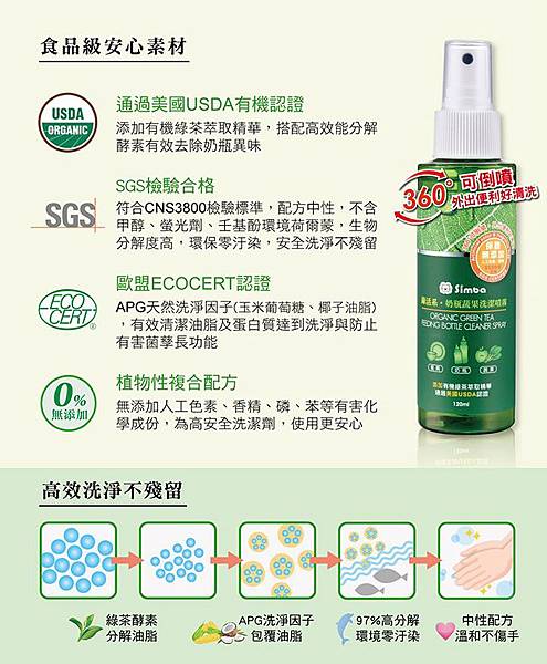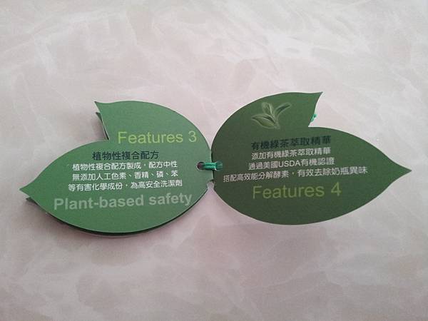 1.添加有 機綠茶萃取精華,通過美國USDA有 機認證,搭配高效能分解酵素有 效去除奶瓶異味。