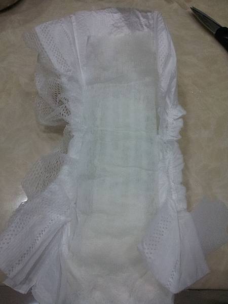 用剪刀慢慢把尿布上方的不織布剪開
